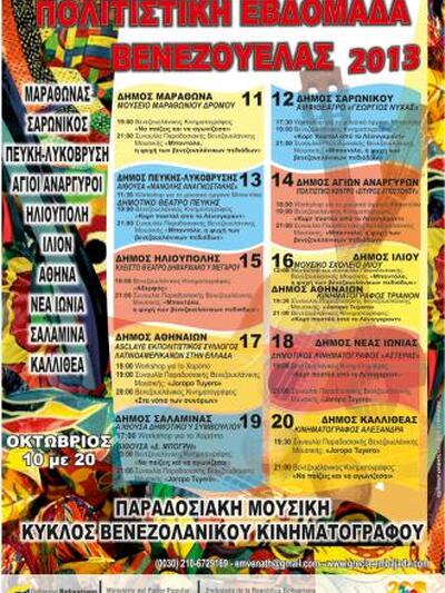 Από την Πέμπτη 10 έως και την Κυριακή 20 Οκτωβρίου 2013 η Πρεσβεία της Μπολιβαριανής Δημοκρατίας της Βενεζουέλας στην Ελλάδα, σε συνεργασία με την κινηματογραφική εταιρεία διανομής NEW STAR, με δέκα Δήμους της Περιφέρειας της Αττικής, με Μουσικά Σχολεία, τον Σύλλογο Λατινοαμερικανών της Ελλάδας και την ASCLAYE, διοργανώνει Πολιτιστική Εβδομάδα Βενεζουέλας,