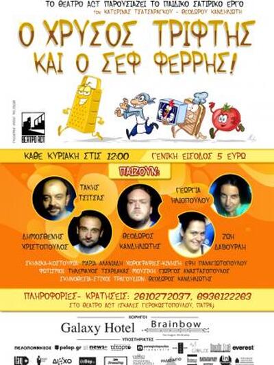Το θέατρο Act της Πάτρας, στις σκάλες Γεροκωστοπούλου, εκτός από τις παραστάσεις για μεγάλους θεατές, από φέτος θα παρουσιάσει από την Κυριακή 20 Οκτωβρίου 2013, στις 12 το μεσημέρι και κάθε Κυριακή καθ όλη την χειμερινή περίοδο, την παιδική θεατρική παράσταση με τίτλο «Ο Χρυσός Τρίφτης και ο Σεφ Φέρρης», των Κατερίνας Τσατσαράγκου και Θεόδωρου Κανδηλιώτη.