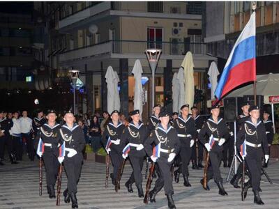 Ο διοικητής του Ρωσικού πλοίου κατέθεσε στεφάνι στο άγαλμα του Καποδίστρια στην πλατεία Μαρκάτου, σε ένδειξη τιμής στο πρόσωπο του πρώτου του κυβερνήτη της χώρας, ένα πρόσωπο άμεσα συνδεδεμένο με την ιστορία και των δύο χωρών, ενώ στη συνέχεια το τιμητικό άγημα συνοδευόμενο από την μπάντα του στόλου της Μαύρης θάλασσας, παρήλασε στους κεντρικούς δρόμους της πόλης μέχρι την πλατεία Γεωργίου όπου παρουσίασε ένα σύνθετο θέαμα, με επίδειξη δεξιότητας χειρισμού όπλων, χορού και μουσικής.