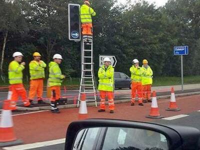Εξι εργάτες στέκονται και παρακολουθούν έναν συνάδελφό τους να αλλάζει μια καμμένη λάμπα δημόσιου φωτισμού, σε δρόμο της κωμόπολης Ντέβον στη Βρετανία. Η φωτογραφία που δημοσιεύει σήμερα η Mirror, κάνει το γύρο του διαδικτύου με εύστοχα σχόλια από δεκάδες πολίτες που βλέπουν μάλλον ειρωνικά την ελληνικότατη αυτή συνήθεια!