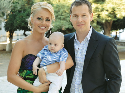 Το μικρό τους γιο Κωνσταντίνο βάπτισαν το Σάββατο 26 Ιουνίου στον Ιερό Ναό Αγίας Κυριακής στον Άγιο Βασίλειο, ο γναθοχειρουργός Σπύρος Καρατζάς και η σύζυγός του αρχιτεκτόνισσα Δήμητρα Σπηλιοπούλου, με αναδόχους το ζεύγος Ιωάννας και Γιώργου Σκαναβή. Μετά το μυστήριο ακολούθησε δεξίωση στο πανοραμικής θέας On Court Tennis Club. Η εξαιρετική διακόσμηση σε ναυτικό ύφος βασίστηκε σε μια ιδέα της μητέρας και υλοποιήθηκε από τον Φώτη Στεργίου.