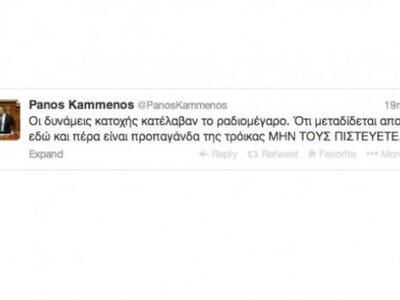 Η πρώτη αντίδραση, αρχηγού κόμματος, για την επέμβαση των ΜΑΤ στο Ραδιομέγαρο της Αγίας Παρασκευής, ήρθε από τον Πάνο Καμμένο των Ανεξάρτητων Ελληνων μέσω twitter.
