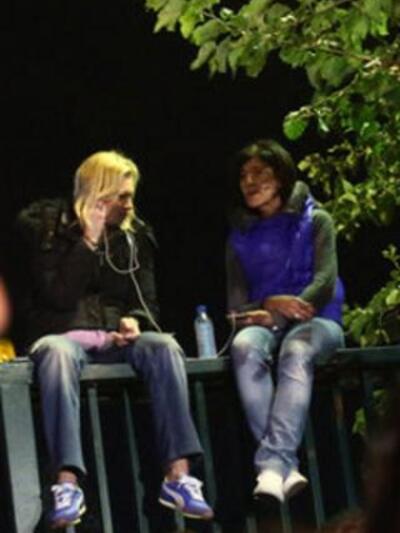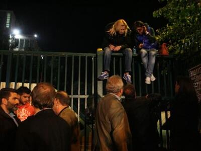 Πλάι σε μια εργαζόμενη της ΕΡΤ που σκαρφάλωσε στην καγκελόπορτα έσπευσε να ανέβει και η βουλευτής των Ανεξάρτητων Ελλήνων Ραχήλ Μακρή, ντυμένη με αθλητικά παπούτσια, ροζ μπανάνα γνωστής αθλητικής φίρμας και επαναστατικό τζιν.