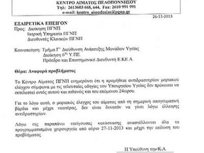 Το έγγραφο αναφέρει: «Το Κέντρο Αίματος ΠΓΝΠ ενημερώνει ότι η προμήθεια αντιδραστηρίων μοριακού ελέγχου σύμφωνα με τις τελευταίες οδηγίες του Υπουργείου Υγείας δεν πρόκειται να εκτελεστεί εντός αυτού και πιθανώς και του επόμενου 24ωρου. Για το λόγο αυτό, ο μοριακός έλεγχος του αίματος από τη σημερινή απογευματινή βάρδια και μέχρι νεωτέρας, δεν είναι δυνατόν να γίνει λόγω έλλειψης αντιδραστηρίων. Λόγω της παραπάνω επείγουσας κατάστασης αναστέλλονται όλα τα προγραμματισμένα χειρουργεία από αύριο 27-11-2013 και μέχρι την επίλυση του προβλήματος».