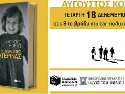 Η ομάδα πολιτισμού & επικοινωνίας AREA 51, το βιβλιοπωλείο «Γωνία του Βιβλίου» και οι εκδόσεις Πατάκη, παρουσιάζουν το νέο μυθιστόρημα του Αυγούστου Κορτώ, με τίτλο «Το βιβλίο της Κατερίνας», και σας προσκαλούν την Τετάρτη 18 Δεκεμβρίου 2013, στις 8 το βράδυ στο bar - πολυχώρο ghetto (Ευμήλου 8, πίσω από τον σταθμό του ΟΣΕ Αγ. Ανδρέα).