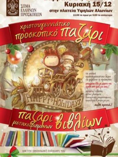 "Το 5ο Σύστημα Αεροπροσκόπων Πάτρας σας προσκαλεί στο Χριστουγεννιάτικο Παζάρι του, το Σάββατο 14 και την Κυριακή 15 Δεκέμβρη 2013 στη Πλατεία Υψηλών Αλωνίων από τις 11:00 το πρωί μέχρι τις 5:00 το απόγευμα.