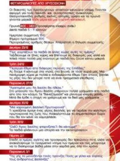 Ο χώρος πολιτιστικών δράσεων "στου φεγγαριού την άκρη" οργανώνει θεματικά γιορτινά πρωινά για παιδιά 5 - 11 χρονών τις εργάσιμες ημέρες που δεν λειτουργούν τα σχολεία(23/12 - 7/1). Ένα χρωματιστό σπιτάκι στην άνω πόλη περιμένει τα παιδιά να παίξουν, να γευτούν, να κατασκευάσουν, να ανακαλύψουν την μαγεία των ημερών.