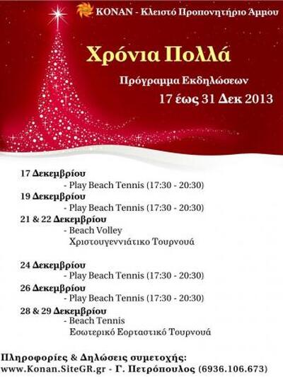 Οι ...αθλητικές συνήθειες και trend του καλοκαιρίου, τα σπορ Beach Volley και Beach Tennis, πλέον συνεχίζονται ακόμη και μέσα στις γιορτές των Χριστουγέννων και της Πρωτοχρονιάς! Σήμερα και αύριο στο Κλειστό Προπονητήριο ΚΟΝΑΝ στα Δεμένικα της Πάτρας διεξάγεται Χριστουγεννιάτικο τουρνουά Beach Volley ενώ το πρόγραμμα των εορταστικών event για τους φίλους της...ρακέτας αυτή τη φορά συνεχίζεται το επόμενο Σαββατοκύριακο με το Τουρνουά Beach Tennis!