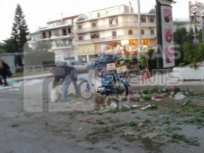 Ένα άνδρας που επέβαινε στο δίκυκλό του σταμάτησε το μεσημέρι του Σαββάτου και αφού είχε τελειώσει η λαϊκή αγορά για να μαζέψει ότι είχε περισσέψει από τον πάγκο μαναβικής.