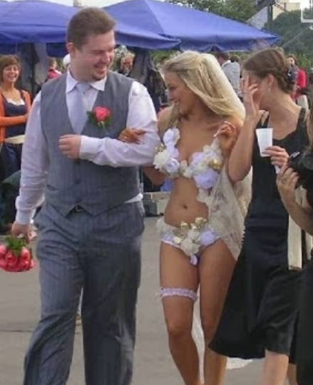Κοιτάζοντας το «νυφικό» αναρωτιόμαστε αν φόρεσε μόνο τα εσώρουχα και θεώρησε περιττό το φουστάνι και αν ο γαμπρός μπορεί να αισθάνεται σίγουρος.