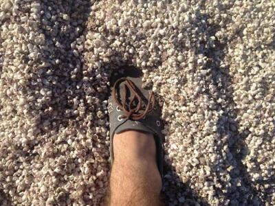 Πρόκειται για την ακτή του Salton Sea, τη μεγαλύτερη λίμνη στην Καλιφόρνια. Οσο περνούν τα χρόνια γίνεται όλο και πιο αλμυρή. Η αλατότητα της λίμνης έχει σαν αποτέλεσμα να πεθαίνουν ολοένα και περισσότερα ψάρια, δημιουργώντας μια διαφορετική άμμο, που δεν είναι τίποτα άλλο από τα κόκκαλα των ψαριών.