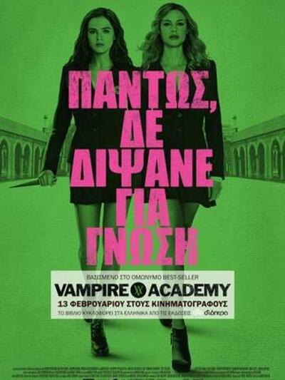 Η ταινία «Vampire Academy» με υπότιτλο «πάντως, δε διψάνε για γνώση» που το σενάριο της έχει βασιστεί στη λογοτεχνική σειρά των έξι βιβλίων Vampire Academy, με συνολικές πωλήσεις παγκοσμίως πάνω από 1 εκατομμύριο αντίτυπα και με βραβείο από την American Library Association, φιλοδοξεί να μεταφέρει στη μεγάλη οθόνη μια νεανική, συναρπαστική και ρομαντική ιστορία βαμπίρ, με στοιχεία μαύρου χιούμορ και έντονη δράση.