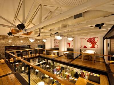 Ο χώρος… ιδιαίτερος, σε κάνει να νιώθεις σαν στο σπίτι σου, αφού αποτελείται από πολλά «δωμάτια» με διαφορετικά καθιστικά στο εσωτερικό τους, με μεγάλα τραπέζια-αναγνωστήρια, ή μικρότερα με φοιτητικού τύπου γραφεία, δωμάτια με καναπέδες σαν σπιτικά καθιστικά, ή άλλα με τραπέζια για φαγητό, προτρέποντάς μας να κάτσουμε όπου θέλουμε ανάλογα με τη διάθεσή μας.