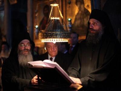 Νωρίς το πρωί ο κ. Σαμαράς παρέστη στη Θεία Λειτουργία στον ιερό ναό του Πρωτάτου στις Καρυές και είπε το «Πιστεύω» και το «Πάτερ Ημών».