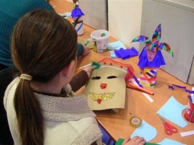 Μέσα στο πνεύμα αυτό και μετά τη διήγηση της ιστορίας και τη συζήτηση που ακολούθησε, τα παιδιά πέρασαν στο πρακτικό μέρος του εργαστηρίου όπου με ανακυκλώσιμα υλικά, έφτιαξαν το δικό τους Αρλεκίνο. Στη συνέχεια έφτιαξαν μάσκες επαναχρησιμοποιώντας εφημερίδες, παλιά υφάσματα, κορδέλες, χαρτοσακούλες… και ότι άλλο κατάφερε να “γλυτώσει”‘ από τον κάδο απορριμμάτων. Χρησιμοποίησαν φαινομενικά «άχρηστα» υλικά που έγιναν αφορμή για αποκριάτικη διασκέδαση.