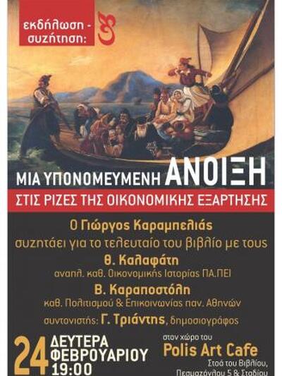 Οι Εναλλακτικές Εκδόσεις και το Polis Art Cafe σας προσκαλούν τη Δευτέρα 24 Φεβρουαρίου, ώρα 19:00 στην παρουσίαση του βιβλίου του Γιώργου Καραμπελιά: Μια υπονομευμένη Άνοιξη στις ρίζες της οικονομικής εξάρτησης.
