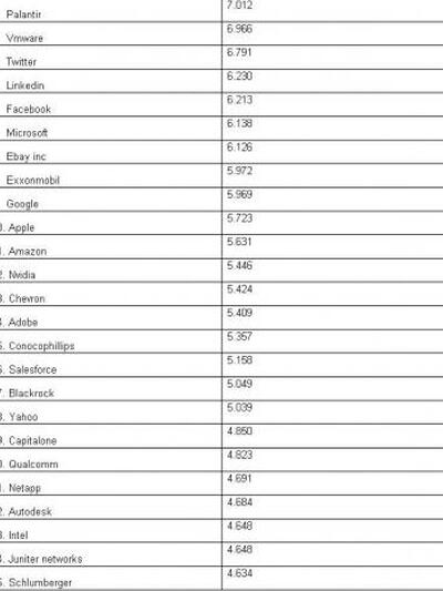 Από τις 25 εταιρείες που συμπεριλαμβάνονται στην έρευνα οι 19 ανήκουν στο χώρο της τεχνολογίας. Τον υψηλότερο μισθό πρακτικής άσκησης προσφέρει η εταιρεία Palantir που κατασκευάζει λογισμικό για τη συλλογή δεδομένων (Data mining= εξόρυξη πληροφορίας/γνώσης από δεδομένα).