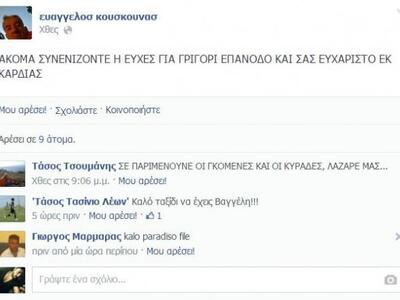 Στην συγκεκριμένη περίπτωση ο Βαγγέλης ξεκουράστηκε. Το εντυπωσιακό είναι πως έφυγε στο σπίτι του και μέχρι την τελευταία στιγμή ενημέρωνε τους φίλους του στο Facebook για την κατάστασή του.