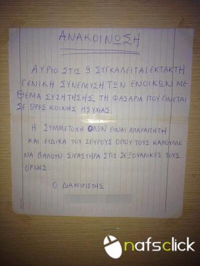 Αύριο στις 21.00 συγκαλείται έκτακτη γενική συνέλευση των ενοίκων με θέμα συζήτησης την φασαρία που γίνεται σε ώρες κοινής ησυχίας.