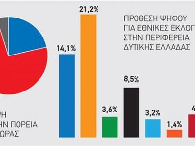 Στην πρόθεση ψήφου για τις εθνικές εκλογές στην Περιφέρεια Δυτικής Ελλάδας ο ΣΥΡΙΖΑ λαμβάνει 21,2%, η Νέα Δημοκρατία 14,1%, το «Ποτάμι» και η Χρυσή Αυγή ισοβαθμούν στην 3η θέση με 8,5%, ακολουθεί το ΚΚΕ με 4% και έπονται το ΠΑΣΟΚ με 3,6%, οι Ανεξάρτητοι Ελληνες με 3,2% και η Δημοκρατική Αριστερά με 1,4%.