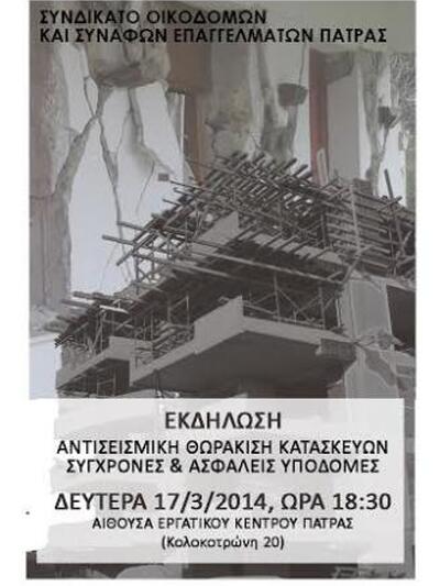 Εκδήλωση για την αντισεισμική θωράκιση διοργανώνει σήμερα το Συνδικάτο Οικοδόμων Πάτρας.