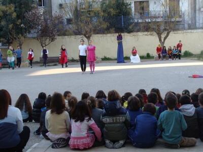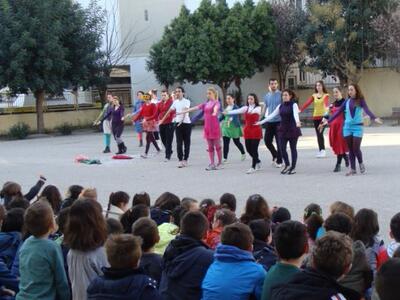 Οι μικροί μαθητές απόλαυσαν την υπέροχη μουσικοχορευτική παράσταση των 30 φοιτητών του Πανεπιστημίου Πατρών που πραγματοποιήθηκε στο προαύλιο του Σχολείου και μαγεύτηκαν από το τραγούδι της θεατρολόγου Μαριεντίνας Βουρδέρη .