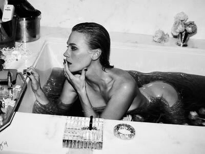 Η ξανθιά καλλονή στο πλαίσιο της σούπερ sexy φωτογράφησης πόζαρε σε ένα καναπέ φορώντας μόνο μια γούνα και τις μαύρες γόβες της, στο μπάνιο εντελώς γυμνή και σε ένα κρεβάτι με μαύρα σατέν εσώρουχα!