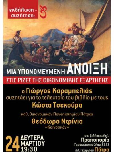 Για το βιβλίο θα μιλήσουν: Κώστας Tσεκούρας, καθ. Οικονομικών Πανεπιστημίου Πάτρας, Θεόδωρος Ντρίνιας, «Κοινοτικόν», και ο συγγραφέας του βιβλίου. Στο βιβλιοπωλείο Πρωτοπορία, Γεροκωστοπούλου 31-33, πλατεία Γεωργίου, Πάτρα