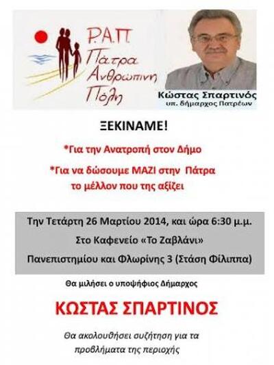 Την Τετάρτη, 26 Μαρτίου, και ώρα 6.30 μ.μ., ο υποψήφιος Δήμαρχος Κώστας Σπαρτινός θα μιλήσει σε ανοικτή εκδήλωση, στο καφενείο "Το Ζαβλάνι", Πανεπιστημίου και Φλωρίνης 3 (στάση Φίλιππα).