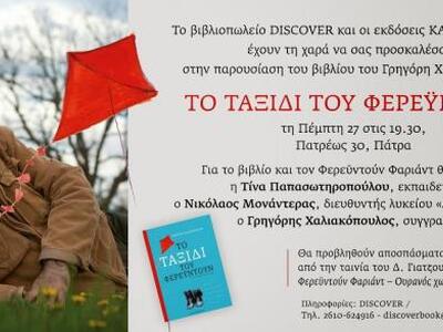 Το βιβλιοπωλείο "Discover" και οι εκδόσεις Καλειδοσκόπιο προσκαλούν το κοινό στην παρουσίαση του βιβλίου του Γρηγόρη Χαλιακόπουλου με τίτλο «Το ταξίδι του Φερεϋντούν» αυτή την Πέμπτη 27 Μαρτίου 2014 στο χώρο του βιβλιοπωλείου, στις 19.30 το απόγευμα (οδός Πατρέως 30, Τηλ:2610624916).