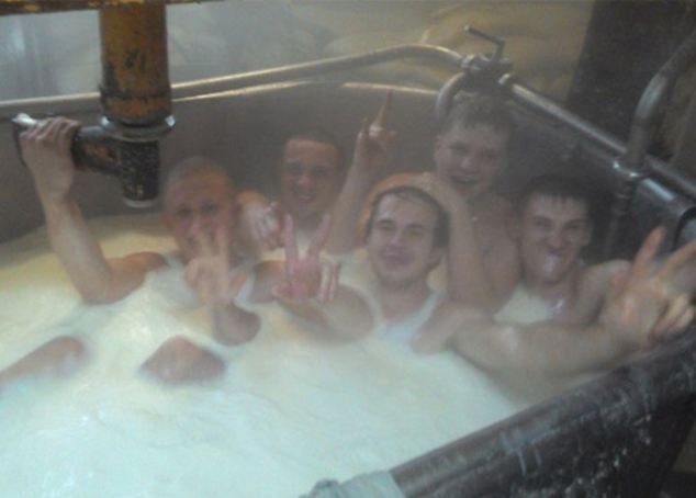 Οι Ρώσοι εργάτες αλά... Κλεοπάτρα πόζαραν κολυμπώντας στις δεξαμενές γάλακτος και ανέρτησαν τις φωτογραφίες στο διαδίκτυο.
