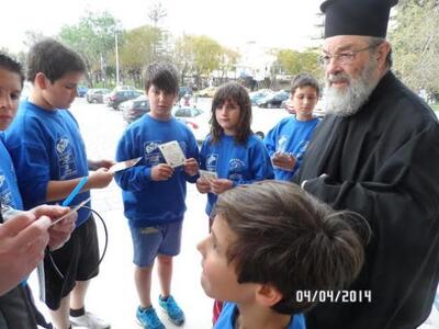 Αντιπροσωπία των αθλητών-τριων, των γονέων των παιδιών ο κ. Κώστας Μπούλης και των προπονητών η κ. Βάσω Βουκελάτου και ο κ. Γιάννης Παπαγιαννόπουλος, παρέδωσαν στο Πατήρ Νικόλαο Σκιαδαρέση τα τρόφιμα και αυτός με την σειρά του φιλοξένησε τα παιδιά, όπου τους μίλησε και τους συνεχάρη για την ιδέα και την κίνηση τους, ενώ τους έδωσε ως ενθύμιο την εικόνα του Αγίου Ανδρέα.