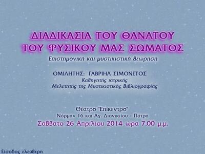 Το θέμα της ομιλίας του θα είναι «Διαδικασία του Θανάτου του φυσικού μας σώματος, Επιστημονική και Μυστικιστική θεώρηση».