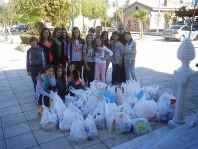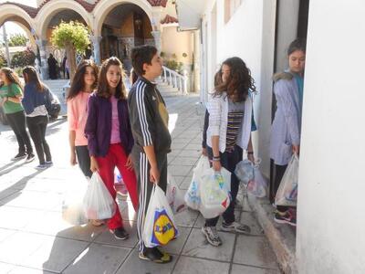 Αντιπροσωπεία μαθητών και μαθητριών, συνοδευόμενη από τον εξαίρετο υποδιευθυντή κύριον Αθανάσιο Μπαγκαστάθη, προσήλθαν με χαρούμενη την όψη και με μάτια λαμπερά γεμάτα με ενθουσιασμό και αγάπη στην καρδιά για να προσφέρουν τρόφιμα, γάλατα και άλλα είδη πρώτης ανάγκης προκειμένου να διατεθούν και να προσφερθούν μέσω του ενοριακού μας Φιλοπτώχου Ταμείου σε οικογένειες ενοριτών μας και όχι μόνον που μαστίζονται από την ανεργία και την γενικότερη κρίση.
