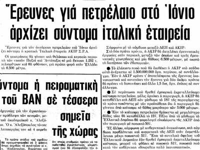 Όπως αναφέρει το paliapatra.gr σε ανάρτησή του, σε δημοσίευμα της τοπικής εφημερίδας "Αλλαγή" το 1981 γίνεται αναφορά στις έρευνες ιταλικής εταιρείας για τον εντοπισμό πετρελαίου στο Ιόνιο !!!