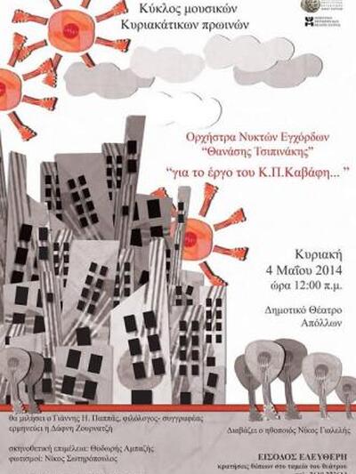 Ο Κύκλος των Κυριακάτικων Μουσικών Πρωινών, που διοργανώνει η Ορχήστρα Νυκτών Εγχόρδων του Δήμου Πατρέων "Θανάσης Τσιπινάκης", συνεχίζεται με μια ακόμη παρουσίαση την Κυριακή 4 Μαίου 2014, ώρα 12.00 π.μ. στο Δημοτικό Θέατρο Απόλλων, με τη συνοδεία της ποίησης του Κ. Π. Καβάφη.