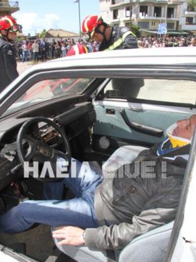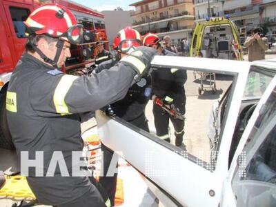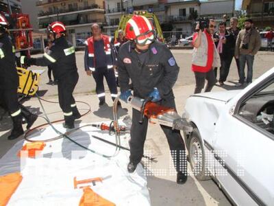 Οι πυροσβέστες ξεκίνησαν την άσκηση με το σενάριο απεγκλωβισμού τραυματία από αυτοκίνητο που ενεπλάκη σε τροχαίο. Το διασωστικό όχημα με το εκπαιδευμένο προσωπικό, πολύ γρήγορα κινήθηκε, έκοψε με τον ειδικό εξοπλισμό τις λαμαρίνες και έβγαλε με ασφάλεια από το όχημα τον τραυματία. Μέσα σε ελάχιστο χρόνο είχε «κοπεί» όλο το όχημα, είχαν αφαιρεθεί πόρτες και ουρανός και ο οδηγός βγήκε από μέσα με τη λιγότερη δυνατή ταλαιπωρία για τον ίδιο. Τον παρέλαβε πλήρωμα διασωστών του ΕΚΑΒ για να τον οδηγήσει στο νοσοκομείο.