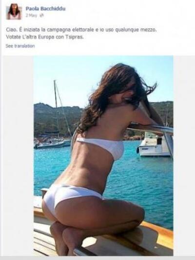 Σάλο έχει προκαλέσει στο facebook η Πάολα Μπακίντου, εκπρόσωπος της λίστας «L' Altra Europa con Tsipras», η οποία ανέβασε φωτογραφία της με λευκό καυτό μπικίνι πάνω σε σκάφος και λεζάντα "Ψηφίστε Τσίπρα".