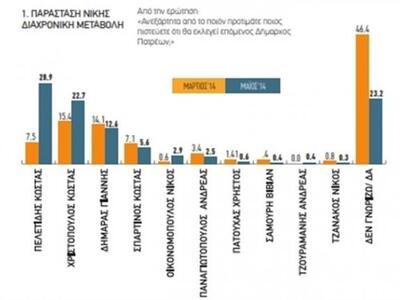 Στον πίνακα που παρουσιάζεται παρακάτω και αφορά την «παράσταση νίκης» μεταξύ Μαρτίου και Μαΐου 2014, οι περισσότεροι «αναποφάσιστοι» Πατρινοί κατευθύνθηκαν προς τον κ. Πελετίδη. Σχεδόν ο ένας στους τρεις Πατρινούς θεωρεί ότι θα εκλεγεί δήμαρχος.