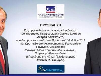 Η κεντρική προεκλογική εκδήλωση του υποψηφίου Περιφερειάρχη Δυτικής Ελλάδας, Ανδρέα Κατσανιώτη θα ξεκινήσει στις 19:30 στο κλειστό Δημοτικό Γυμναστήριο Παναγίας Αλεξιώτισσας (Λοχαγού Μενούνου 30 & Αλεξ. Παπάγου).