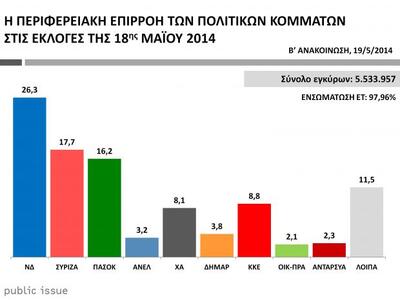 Η περιφερειακή επιρροή των πολιτικών κομμάτων στον α' γύρο των περιφερειακών εκλογών του 2014, με βάση τα εκλογικά αποτελέσματα,σύμφωνα με την Public Issue, είναι η ακόλουθη: