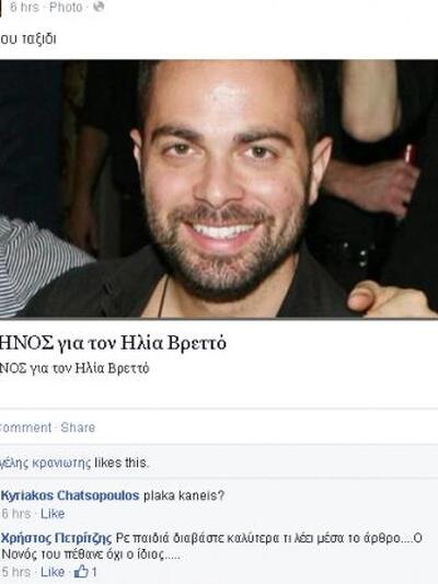 Πέθαναν τον Ηλία Βρεττό με τη γνωστή μέθοδο του "Ήξεις, αφήξεις ουκ εν πολέμω θνήξεις" της Πυθίας! Η φωτογραφία που χρησιμοποιούν πάντα είναι του επώνυμου, αλλά η είδηση αφορά κάποιον δικό του άνθρωπο που χάθηκε ή περνά δύσκολες ώρες.