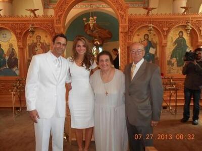 Ντυμένοι και οι δυο στα λευκά βρέθηκαν σε Ορθόδοξη Εκκλησία μαζί με λίγους καλούς φίλους και τους γονείς της παρουσιάστριας. Μετά τη βάφτιση ακολούθησε παραδοσιακό ελληνικό γλέντι με ελληνικά φαγητά και πολλά coctails.