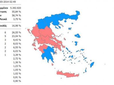 Δείτε πως διαμορφώνεται το εκλογικό αποτέλεσμα σε όλες τις περιφέρειες της Ελλάδας, με την ενσωμάτωση να πλησιάζει το 60%.