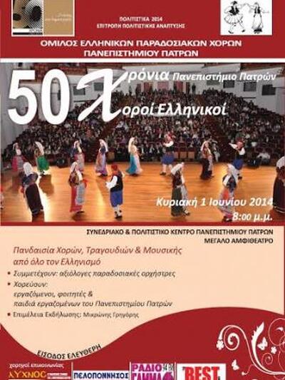 Ο Όμιλος Ελληνικών Παραδοσιακών Χορών του Πανεπιστημίου Πατρών συμμετέχει στις εκδηλώσεις για την επέτειο των 50 ετών από την ίδρυση του Πανεπιστημίου Πατρών, με ένα ξεχωριστό χορευτικό και μουσικό πρόγραμμα με γενικό τίτλο, «50 Χρόνια Πανεπιστήμιο Πατρών – 50 Χοροί Ελληνικοί». Μια περιήγηση στη μουσική παράδοση του τόπου μας παρουσιάζοντας 50 χορούς των Ελλήνων.