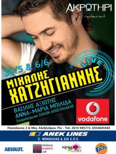 O αγαπημένος του κοινού τραγουδιστής και τραγουδοποιός Μιχάλης Χατζηγιάννης θα βρεθεί στην Πάτρα για δύο μοναδικές εμφανίσεις σήμερα Παρασκευή 30 Μαίου 2014 και την προσεχή Παρασκευή 6 Ιουνίου το βράδυ.