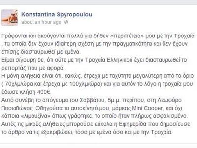 Ένα δημοσίευμα της εφημερίδας Espresso ήταν αρκετό για να προκαλέσει την απάντηση της Κωνσταντίνας Σπυροπούλου σχετικά με την περιπέτεια του περασμένου Σαββάτου με την τροχαία. Όπως γράφτηκε, η παρουσιάστρια φαίνεται να οδηγούσε με υπερβολική ταχύτητα, να μην φορούσε ζώνη ασφαλείας και ταυτόχρονα να μιλάει και στο τηλέφωνο.