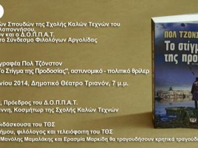 Σας προσκαλούμε στην εκδήλωση που διοργανώνει το Τμήμα Θεατρικών Σπουδών της Σχολής Καλών Τεχνών του Πανεπιστημίου Πελοποννήσου, με το Δήμο Ναυπλιέων και το Δ.Ο.Π.Π.Α.Τ. σε συνεργασία με το Σύνδεσμο Φιλολόγων Αργολίδας για την παρουσίαση του Σκoτσέζου συγγραφέα Πολ Τζόνστον και του βιβλίο του "Το Στίγμα της Προδοσίας", αστυνομικό - πολιτικό θρίλερ την Παρασκευή 6 Ιουνίου 2014 στο Δημοτικό Θέατρο Τριανόν, 7 μ.μ.