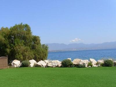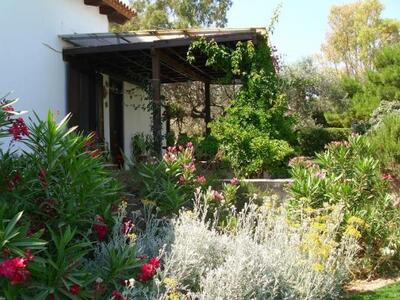 Η Μαργαρίτα Παπανδρέου με μεγάλο ψάθινο καπέλο, πέρλες στο λαιμό και κατακόκκινο μπλουζάκι χαμογελάει στο φακό. Το καταφύγιό της στα Λουτρά Αγίας Ελένης που βρίσκεται σε απόσταση αναπνοής από τη θάλασσα με τον τεράστιο κήπο γεμάτο λουλούδια.