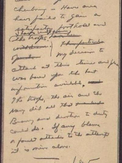 Έγραφε: «Η απόβασή μας στην περιοχή Cherbourg-Havre δεν είχαν ικανοποιητικό αποτέλεσμα και για το λόγο αυτό απέσυρα τα στρατεύματα. Η απόφασή μου να επιτεθούμε τη συγκεκριμένη στιγμή στο συγκεκριμένο σημείο ελήφθη με βάση τις ασφαλέστερες πληροφορίες που είχαμε διαθέσιμες. Τα στρατεύματα, η αεροπορία και το ναυτικό έκαναν το καλύτερο που μπορούσαν, με γενναιότητα και αφοσίωση στο καθήκον. Κάθε ευθύνη ή υπαιτιότητα για την προσπάθεια είναι μόνο δική μου».